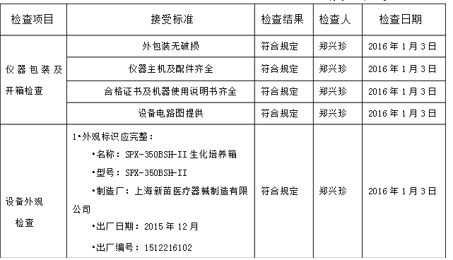 2016年1月3日,購進了上海新苗醫(yī)療器械制造有限公司制造的型號為150SPX生化培養(yǎng)箱一臺,放置在質(zhì)量控制部微生物室內(nèi)。2016年1月3日,驗證小組對該設備資料、外觀、安裝條件進行了確認。確認結果如下: