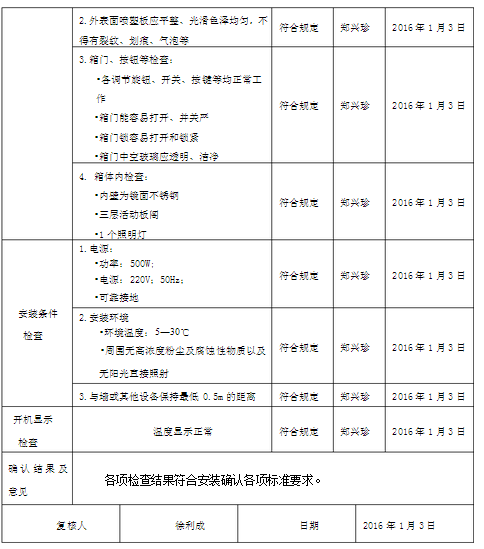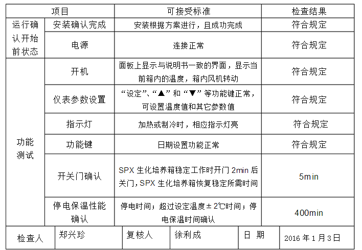 2016年1月3日,驗證小組對SPX生化培養(yǎng)箱進行了通電測試、斷電的運行測試,記錄如下: