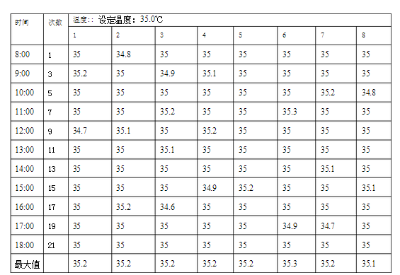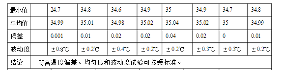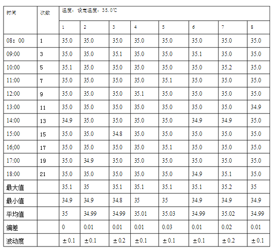 滿載時連續(xù)測試10小時,測試過程中每隔1小時記錄一次溫度,根據(jù)記錄的溫度值計算溫度變差和溫度波動度。將留點溫度計按確認方案的要求布置,設定溫度為35.0℃,待數(shù)值穩(wěn)定后開始讀數(shù),每隔1小時記錄一次測量值,自2016年1月5日早上8::00**2016年1月5日18:00共計記錄10 次。