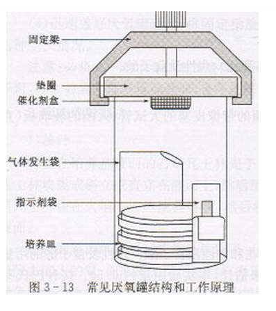 厭氧培養箱類似,但因為體積小、攜帶方便,使用起來十分方便。圖3—13顯示了一般常用的厭氧罐的基本結構。