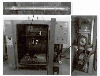 普通恒溫鼓風干燥箱在安裝電動機、蝸輪減速機、變頻器及主軸后,與配套的小型反應釜結合,實現了在水熱合成過程中反應釜內部物料的動態反應,可以在很多實驗中替代動態水熱反應釜用于動態水熱合成實驗。經過本科生及研究生的多次使用后,發現改裝后的鼓風干燥箱與聚四氟乙烯內襯和不銹鋼外襯組合反應釜相配套使用,完全可以用于動態水熱合成實驗。相比較帶攪拌槳的動態反應釜而言,該設備在同一時間可以進行不同原料配合比下的實驗,這樣節省了大量的實驗時間,使用時簡單方便,受到廣大師生的一致好評。由于實驗量較大,實驗室進行了第二個烘箱的改裝,改裝后的烘箱及結構如圖 2 所示,基本改裝方法與**個相同。但