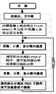 AT 89C系列單片機共 4個接口 ( P0、 P1、 P2、 P3 )32位 ,本系統所需的接口如下: 4× 4鍵盤占 8位; A /D轉換器 7135需 12位; 微型打印機 10位; 監視器 CRT(串口 ) 2位; 12位數碼顯示器 LED 需 20位 I / O 口 (用并行口 , 12位 , 8段 ); 輸出控制位 4位; 2 個控制二選一轉換開關 4066需 2位; 中斷 2位; X25045需 4位 ,故共需 64位 I /O 口。如擴展 I /O 口 則將使系統變得既龐大、又雜復。本文使用單片機接口的復用技術 ,可以使系統大大簡化。在復用技術中應遵循兩條原則: 除了輸出控制位之外 ,其它 I /O 口位都可以使用復用技術; 充分利用單片機接口各位 ,只有到單片機本身接口不夠使用時才使用接口復用技術。 1. 1. 1 CRT 監視器與 LED顯示器共用串口 如果不用接口復用技術 ,單片機與 PC機的通訊用了串口 ( 2位 ) , LED顯示就只能用并口動態顯示 ( 10+ 8= 18位 ) ,總共需 20位。本系統 LED 顯示采用通過串入并出接口 74LS164實現靜態顯示。如圖 1所示 ,只要用單片機的 1位作二選一開關 4066 的控制位 ,亦即只用單片機的 3位 ,就達到了使兩種顯示器共用串口的目的。 這樣既節省了 I /O 口 ,也節省了為 LED動態顯示 CPU 所花費的時間。 1. 1. 2 鍵盤與微型打印機共用 P0 口 鍵盤輸入接口與微型打印機輸出接口共用 P0 口 , 鍵盤再用到中斷口 IN T0 , 微型打印機再用到 W R、 RD信號位即可使兩者互不影響。 1. 1. 3 2045與 ICL 7135共用 P1 口 本系統所采用的 A /D 轉換器如圖 1所示的 ICL 7135是四位半雙積分 A /D轉換器。 它具有抗干擾性能好 ,轉換精度高 (相當于 14位二進制數 ) , 自動校零 ,動態字位掃描 BCD碼輸出 ,單基準電壓 , 價格低廉等特點。雖然它的轉換速度較慢 ,但本系統所控的對象—— 溫濕度變化都是緩慢的量 ,是足夠的了[2 ]。 它占用 P1 口 8位 , P2 口 4位。 X25045芯片把 3種常用功能—— 看門口定時器、電壓監視和 E2 PROM 組合在單個封裝之內 ,這種組合降低了系統成本并減少了對電路板空間的要求。 其中 4096位串行 E2 PROM 是按 512× 8組織的 ,是提高系統可靠性及自動化標定與校準的硬件 基礎[4 ]。 ICL7135與 X 25045是分時與 CPU 聯系的 ,二 者復用 P1 接口。 前者雖然是連續工作 ,但取數卻是程序控制。 X25045的工作有嚴格的時序 ,理論分析與工作實踐都證明 , IC L7135的連續工作不會影響 X 25045的工作。 1. 2 信號處理通道設計 測控系統檢測精度的高低在很大程度上取決于信號處理通道的設計質量。 1. 2. 1 傳感器 本系統采用了穩定性、重復性和線性度都較好的鉑電阻 Pt100溫度傳感器和 HS20型 (日本 )濕度傳感器。高精度傳感器是提高檢測精度的重要保證。 1. 2. 2 通過采樣參考值以消除系統漂移 通過多路模擬開關 ,兩個傳感器和參考電阻的信號處理共用一個多路開關 4051放大電路和 A / D 轉換電路 ,通過對參考電阻的采樣與處理 ,既簡化了系統 ,又基本消除了系統的漂移 ,從而提高了檢測精度。 2 系統軟件設計 整個恒溫恒濕箱控制系統是在應用程序的控制下執行的 ,應用程序由主程序、數據巡回采集及處理子程序、 PID 調節子程序、鍵盤中斷服務程序、打印子程序及定時中斷服務程序等組成。 2. 1 主程序主程序流程圖